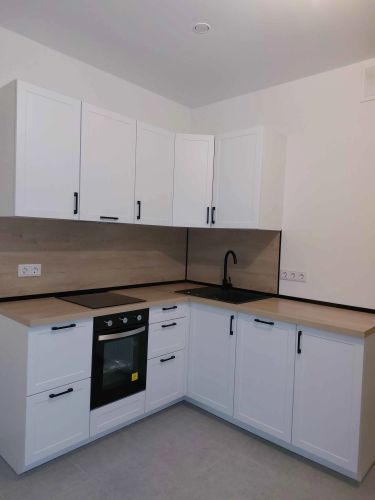 Соберём каркасы, навесим шкафы, дверцы и фурнитуру. Всё отрегулируем. Установим, мойку с сифоном и смесителем.