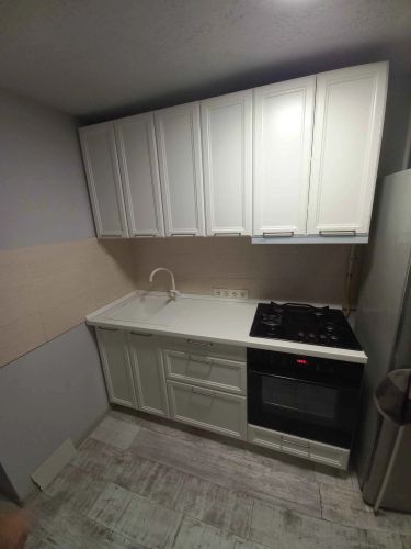 Соберём каркасы, навесим шкафы, дверцы и фурнитуру. Всё отрегулируем. Установим, мойку с сифоном и смесителем.