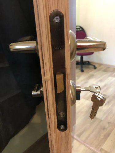 Сделаем торцевое отверстие, установим в него замок и закроем декоративной планкой. Установим ручки с обеих сторон двери. Врежем в коробку ответную часть замка. Работа займёт 30–60 мин. Будет шумно.